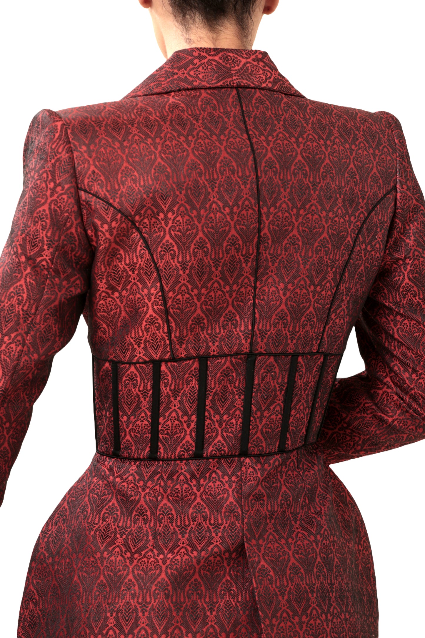 Red corset blazer in sustained Banarasi jacquard